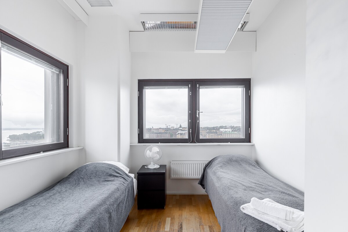 Huikeat panoraamanäkymät kaupungille ja merelle. Metro ja lukuisat raitiovaunut sekä linja-autot kulkevat läheltä. Mahtavien kaupunki- ja merimaisemien lisäksi huoneen varustukseen kuuluu kalusteet mm. hyvä sänky petivaatteineen, jääkaappi, mikro, veden- ja kahvinkeitin, astiat ja tv. Tarjoamme myös autopaikkoja.