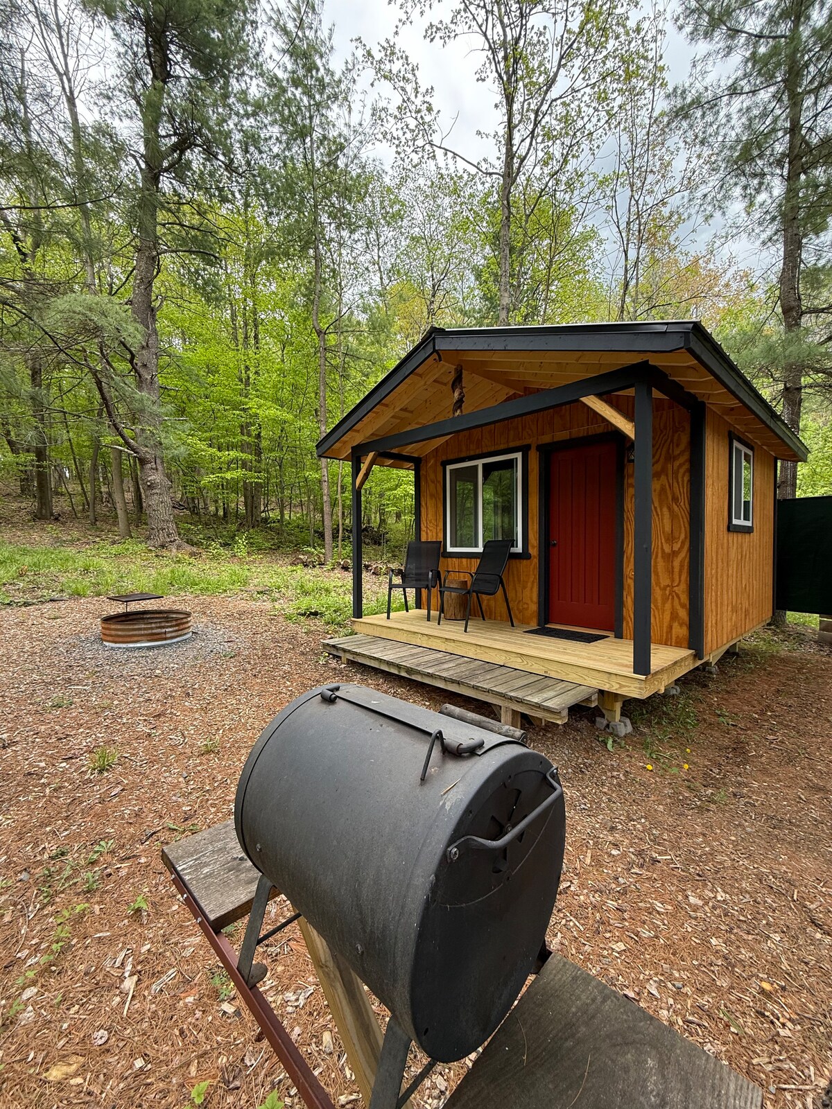 Nestled in a grove of Norway spruce, your peaceful cabin getaway rests in the heart of the Finger Lakes. Built by a local carpenter (with help from his dog Indiana), the cabin has enough coziness and charm to make any stay special. Hike down to Mill Creek (on the property), grill up some burgers on the gas grill, or lounge in a hot tub beneath the stars. The cabin is 15 minutes to Ithaca / Cornell, has a living room with a Switch + BluRay + HBO, and has satellite wifi (30+ MBPS).