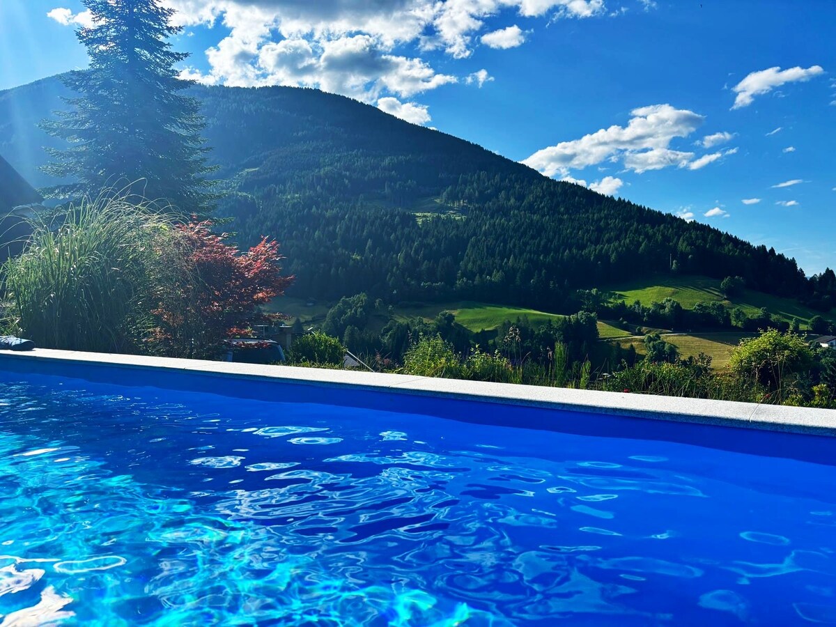 Dream place with private swimming pool in the heart of the lake areas of Karinthie. 5 minutes by car (10 minutes walk to the ski bus) from Bad Kleinkirchheim. Golfing, horseback riding, cycling, water sports, hiking and everything for winter sports, everything is close by. Lovely apartment with its own entrance and lots of privacy. Ideal for 2 people but possibly still room for a third person or e.g. 2 children on the sofa bed in the living room. Very spacious bathroom and complete kitchen. Fantastic mountain views.