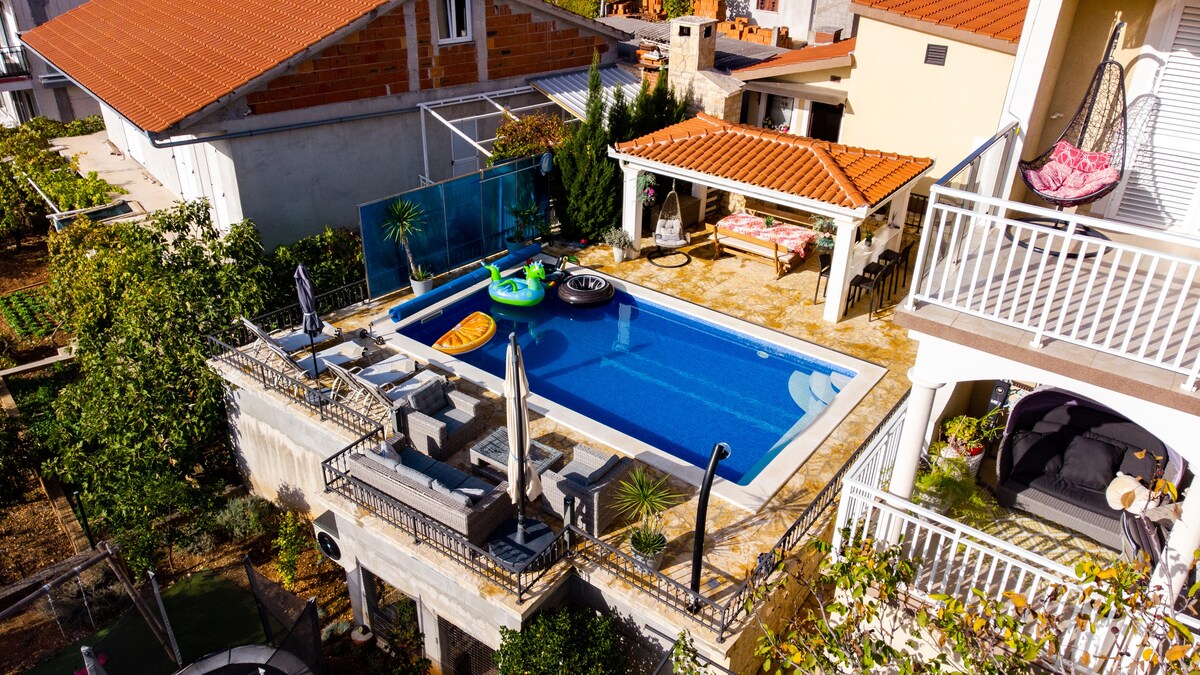This beautiful, well-equipped apartment is located near the center of Trogir. It is located on the first floor of a family house in whose yard is a private swimming pool 8x4 m just for you .Pool got heating and massage part . You also have summer kitchen and a terrace with deck chairs and barbecue also available to guests. Fully high quality equiped gym , ps5 with big screen android TV and sound bar . Rent a boat and day boat tours awailable with some disscount for our guests.