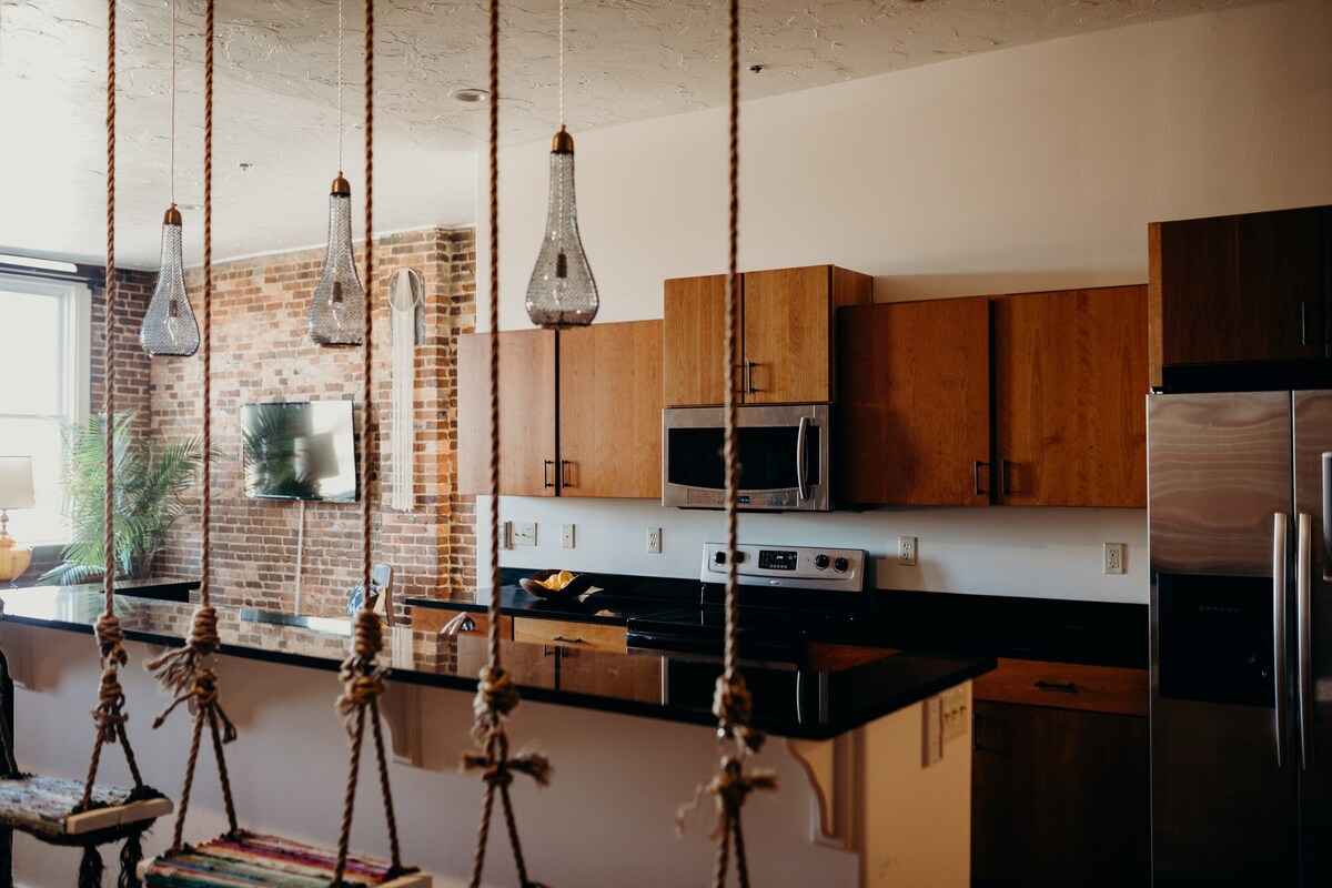 Experience downtown Springfield in style! With exposed brick, hardwood floors, marble backsplash, and soaring 15-foot ceilings, this loft is the perfect place to gather. Walk to coffee shops, eateries, and entertainment venues. Quinn Lofts is home to various professionals and a local art studio. You will hear footsteps, laughter, and traffic. Keypad entry is simple and secure. As your hosts, we live on the same floor and are happy to support you. We look forward to welcoming you to Quinn Lofts!