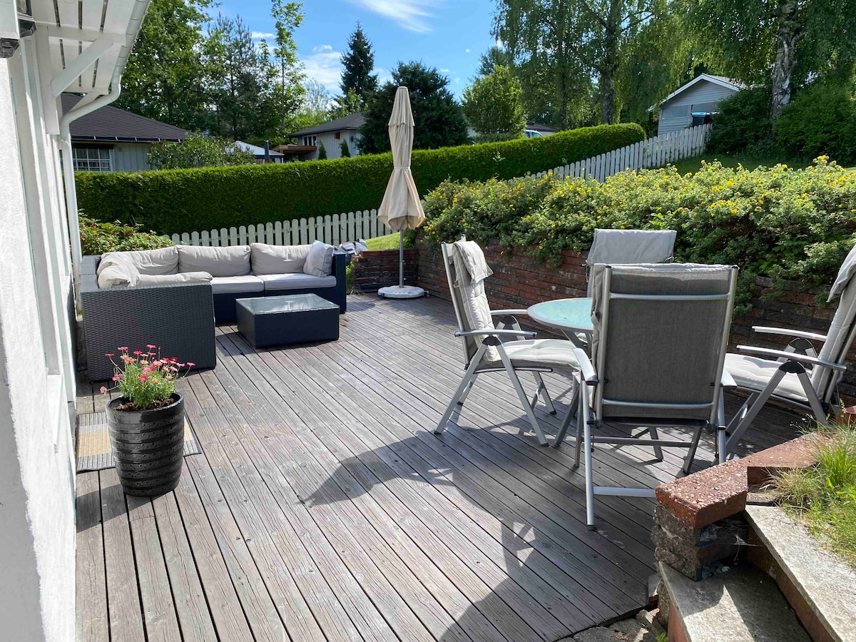 Light and nice apartment, 50 m2. Lovely surroundings! Perfect place for hiking and relaxing. Private entrance and private patio outside. Free parking outside the house. One bedroom with double bed and one single bed. 12 min walk to bus stop, 23 min bus ride to Oslo. 4 km to Sandvika, 8 km to Asker. Quiet and peaceful neighborhood. Sea view, a few meters to jetty and beaches. Rent single/double kayak. Bikes, fishing gear and tennis gear available for free.
