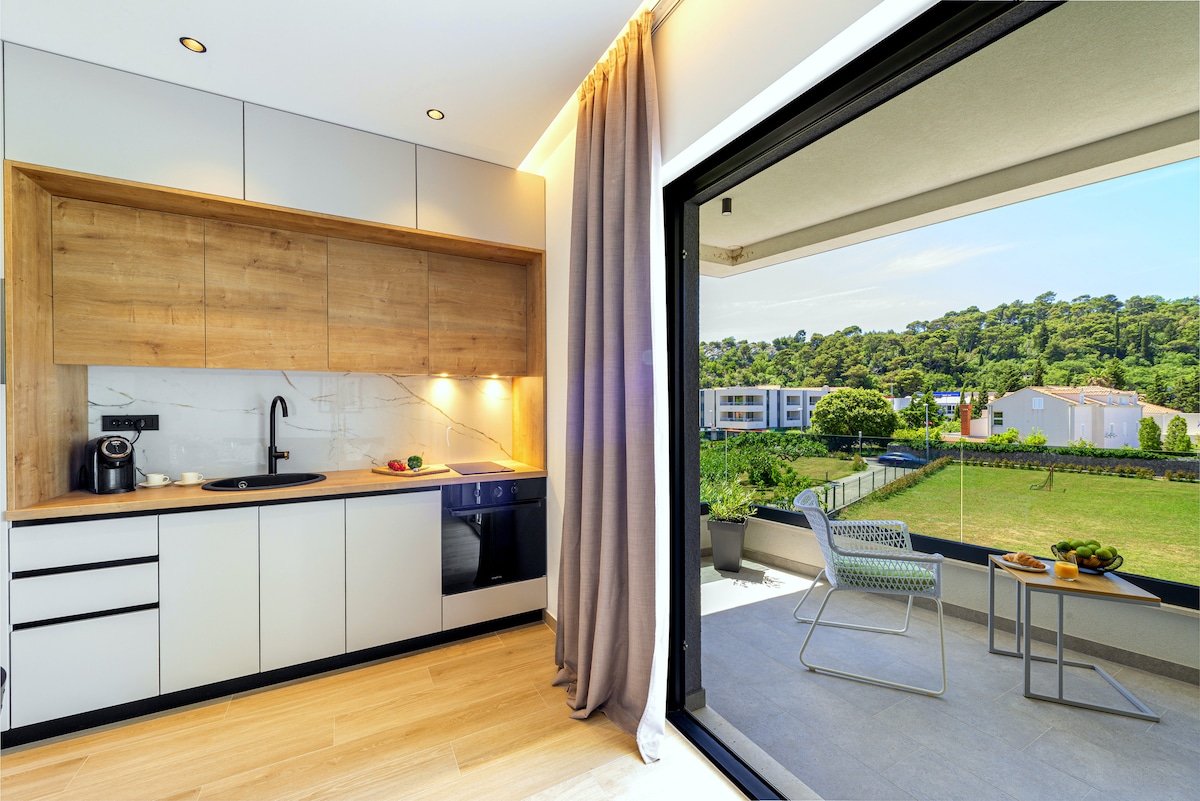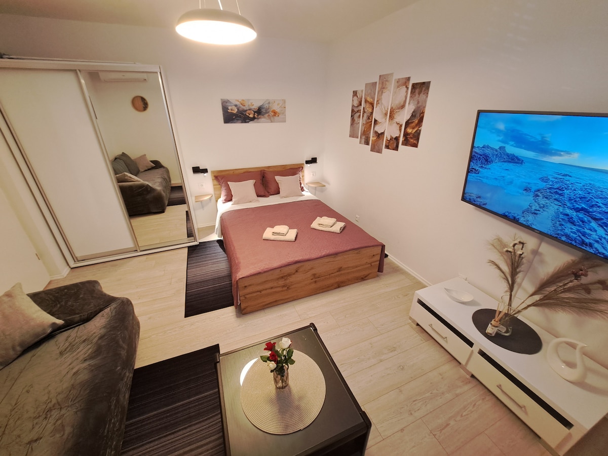 The position of our apartments stands out from the others because in addition to Free parking for its guests and provides a huge green meadow where family can play completely carefree.Beautiful sandy beach is only 300m away, which takes 3 minutes easy walk without any stairs. A shopping center with anything you may need is just below our property. We have large selection of restaurants nearby, from top local to cosy. The bus station connecting Srebreno with the Old Town is only 300m away.