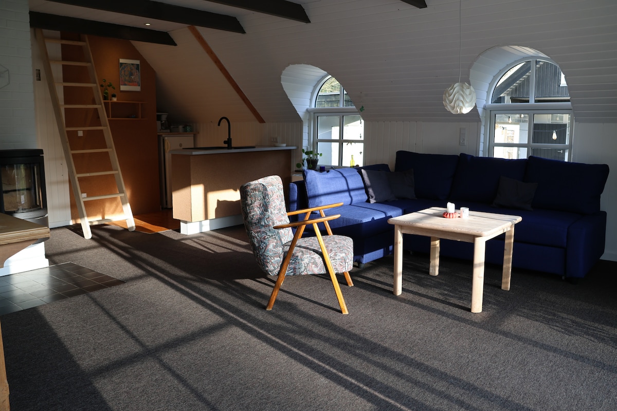 Freshly renovated barn, converted into minimalistic modern apartment. Full kitchen, shower bathroom with sauna and one bedroom with a queen size bed. Open living and dining area, high ceilings and big windows facing west. Indoor fireplace and floor heating in kitchen and bathroom. Surrounded by wide open views, with the dunes in sight towards west and into the countryside on all sides. Sunrise and sunset fully visible.
