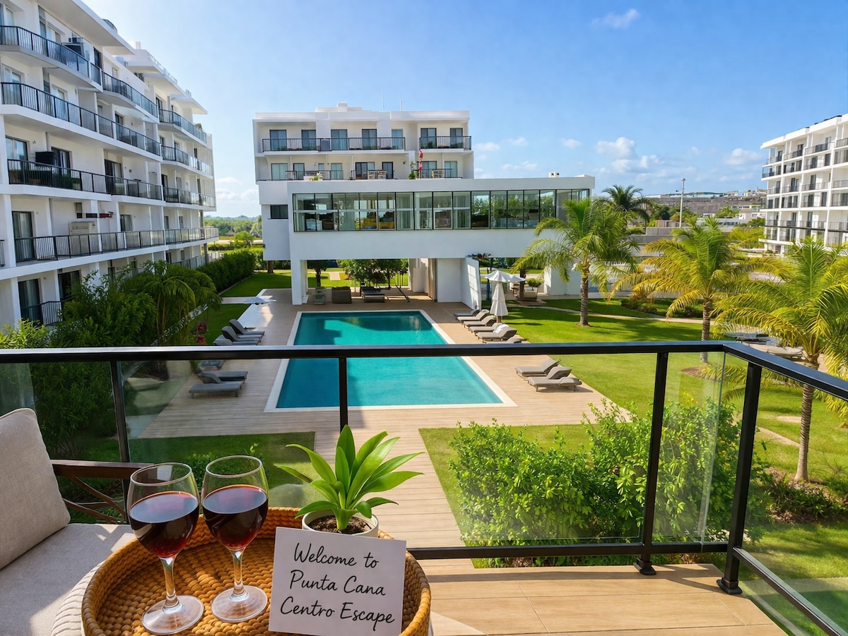 Modern oasis in Downtown Punta Cana, steps from Coco Bongo. Stylish apartment with bright living room, fully equipped kitchen, queen bedroom, modern bathroom, and private balcony. Pool, 24/7 security, and perfect location near restaurants, supermarkets, and top beaches. Ideal for couples, tourists, and business travelers.