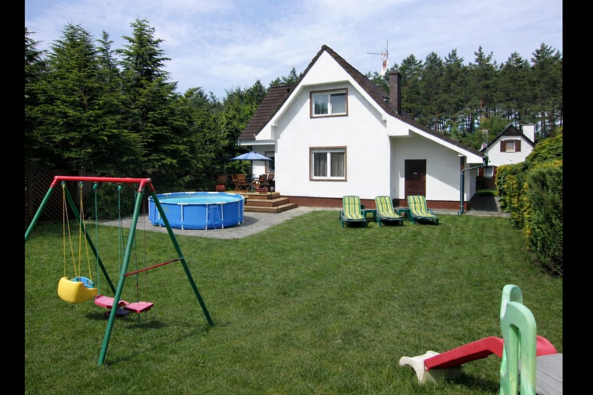 The house is located 150 meters from Lake Miedwie. Beautiful garden with year-round hot tub. A quiet and peaceful place ,perfect for a getaway with family or friends. The ground floor of the cottage is a living room with a kitchenette and a bathroom ,upstairs there is a master bedroom and 2 rooms. In addition to the hot tub, the garden has a dedicated place to relax ,for a barbecue, and parking for 2 cars.