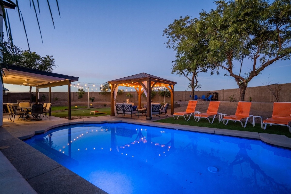 Westgateâs doorway to fun, games & nightlife! 5 min walk to State Farm Stadium, Desert Diamond Arena & Westgate Entertainment District. Less than 30 min drive to all Spring Training facilities. Roomy, fun home w/ great rm, game rm, big kitchen w/ seating for 12+. Resort-style backyard with a HEATED pool, firepit, putting green, BBQ area & dining area. High Speed Internet Comfy sleeping for up to 12. 4 large bedrooms w/ 3 full baths. One of the Central Valleys secret gems! AZTPT: 21470293