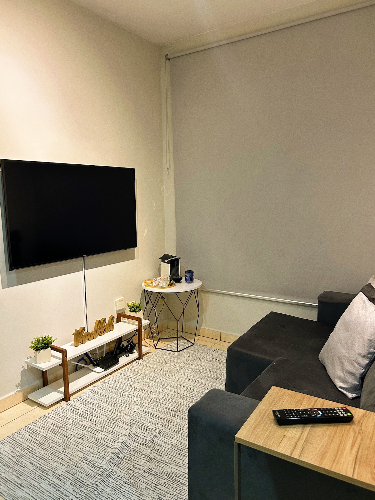 In the kitchen we have a microwave, sandwich maker, electric jug, coffee bottle, refrigerator, 4 plates and forks, 4 knives, 4 glasses for preparing a basic meal or breakfast, cooking is not allowed. In the living room we have a 50" television, 4k technology, a fan, cable TV and 1 sofa bed that accommodates two people. In the bedroom there is 1 32" television, 1 queen size bed, 1 air conditioner. In the bathroom, we have a hairdryer and a retractable clothesline. Free Wi-Fi. The garage is rotating, with no fixed parking space.