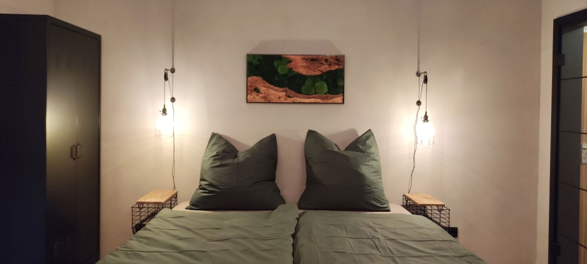 The 78 sqm 2-room apartment in the "House of Encounters" offers space for a cozy vacation experience for families/couples, friends and business travelers. In addition to a separate bedroom, there is a living room with a double sofa bed (TV, fireplace, access to the kitchen). The kitchen has basic equipment (+ dishwasher, fridge) as well as a typical Bavarian sitting area. The bathroom is equipped with two sinks, shower, bathtub, toilet & bidet. On top there is a mini balcony.