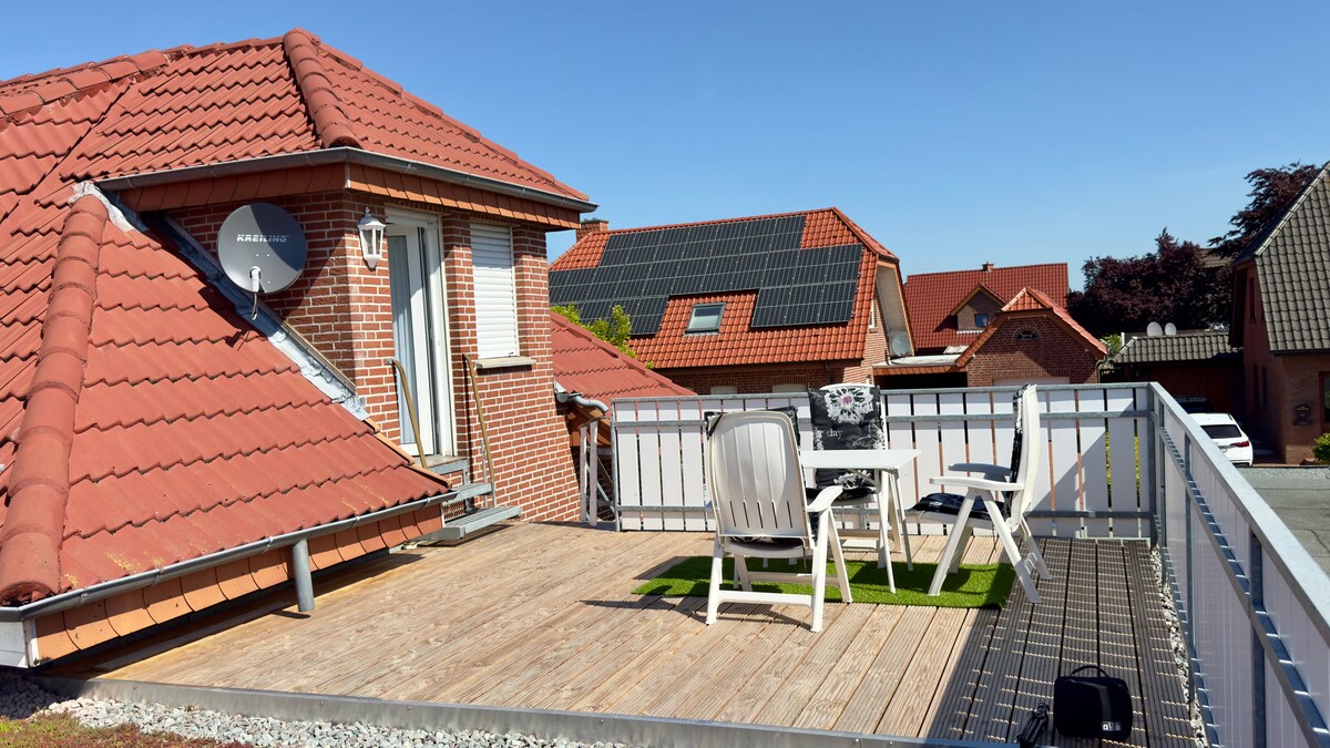 Cozy apartment in Haren-Emmeln with 3 bedrooms, fully equipped kitchen, modern bathroom and bright living-dining area. The roof terrace invites you to relax. Ideal for families of up to 5 people. Quiet location near Dankernsee, Danken Castle, Emslandring and Hümmling Nature Park. Shopping and restaurants nearby. Perfect for relaxation, active vacations and excursions. Near the Dutch border (about 15 minutes by car) Please note that I do not accept fitters!
