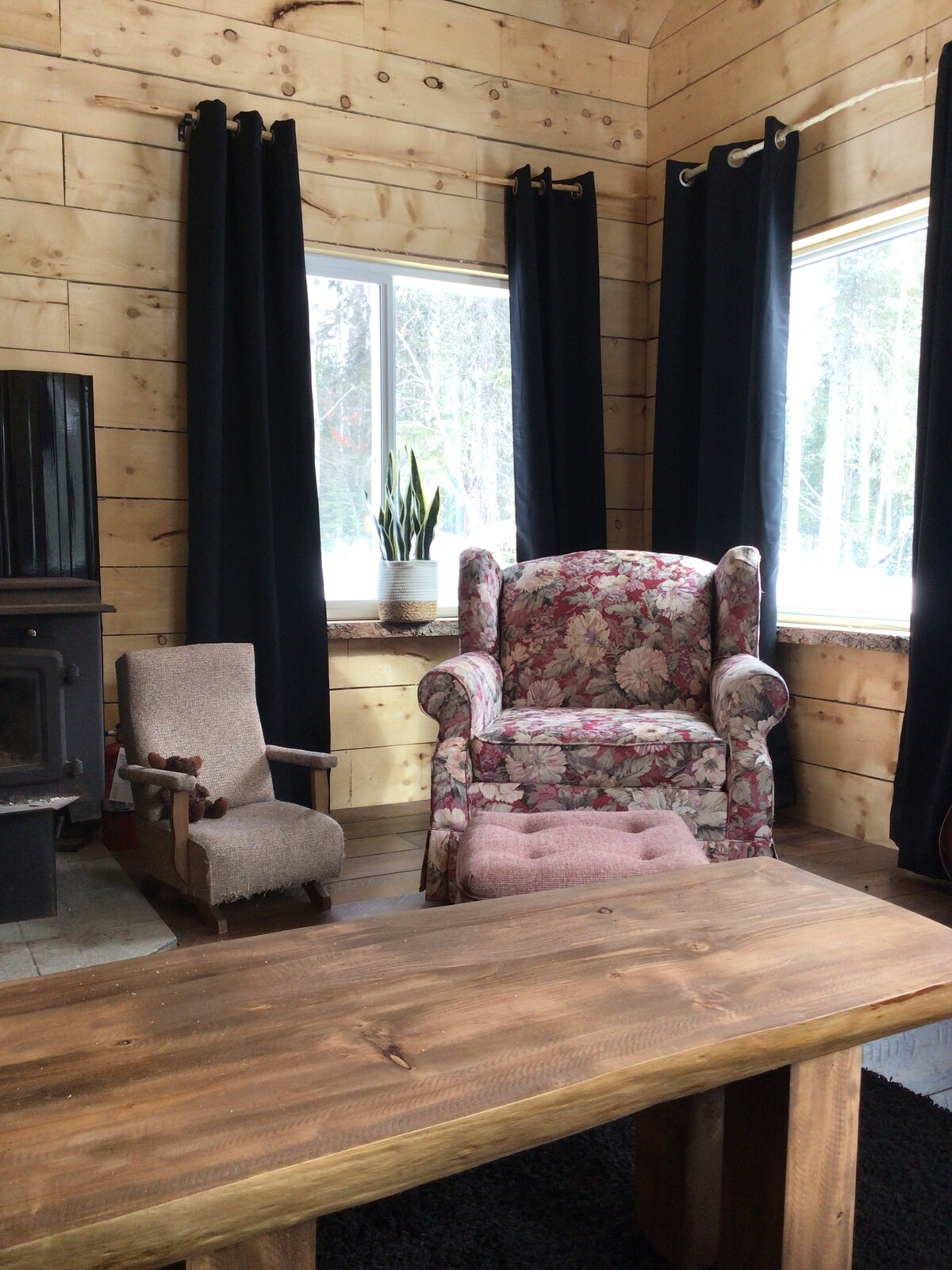 With its open layout and beautiful outdoor space this cabin will provide a relaxing, quiet location to escape to. This cabin is a brand new build. Pine Creek Villa is an off grid / dry cabin fronting onto Pine Creek, approximately 15 km east of Atlin on the Surprise Lake Road. Access is off the Birch Creek Rd. Down a narrow and very rough / bumpy road, with water crossings You will need a high clearance vehicle, ATV/snowmobile, or ability to bike, walk or ski 2-3km is necessary for access