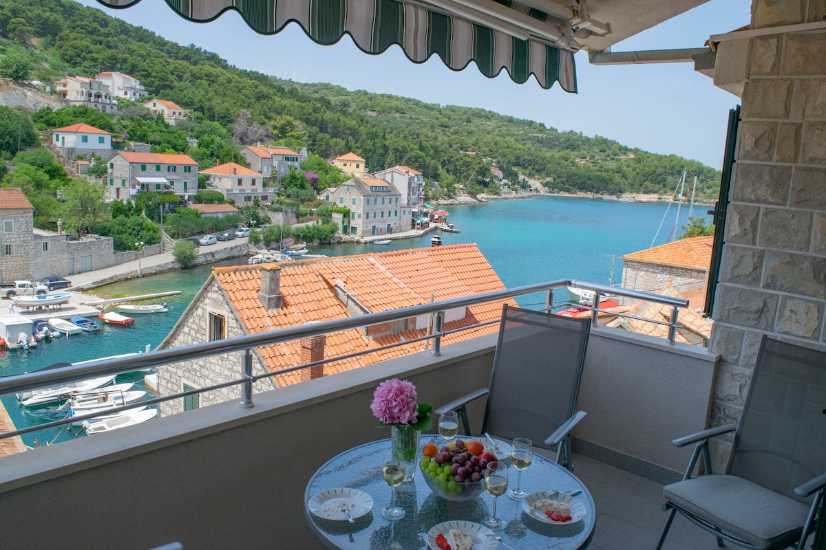 En av tre lägenheter att hyra av värdparet Bosse & Vera. Med dem kan man prata Svenska, Kroatiska eller Engelska. Det är en promenad på ca. 250 meter ner till det klarblå Adriatiska havet. Där kan man välja mellan att bada från klippor eller en vik med stenstrand. Vill man promenera in till den mysiga byn Stomorska så är det ca. 1 km. I byn finns det mataffärer och restauranger. Vill du se de andra lägenheterna Bosse & Vera hyr ut, sök på "Apartment Anna-A2" eller "Apartment Bosse & Vera-A3"