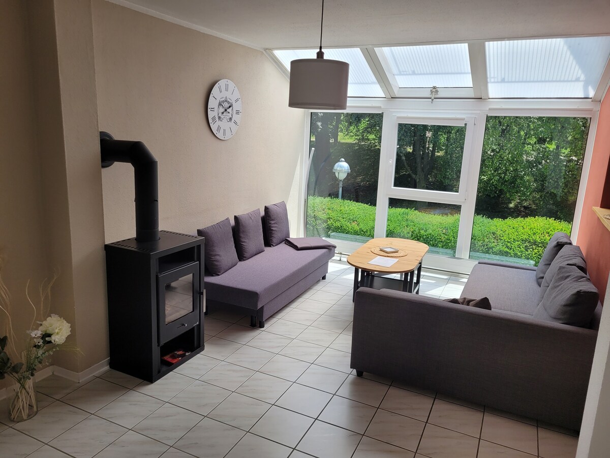 Meine sehr gut ausgestattete Wohnung ist ideal für 2 Personen, falls nötig ist ein weiterer Schlafplatz schnell auf dem ausziehbaren Sofa im Wohnzimmer gerichtet. Auf unserem SMART-TV stellen ich Euch NETFLIX zur Verfügung, für Regentage und eholsame Abende auf dem Sofa :) Ich wohne ruhig, direkt am Wald, wo wunderschöne Wanderwege beginnen. Für Geschäftsreisende ist eine ausreichende Ausstattung vorhanden. 1 Reisekinderbett sowie 1 Hochstuhl stehen für einen kleinen Gast bereit.