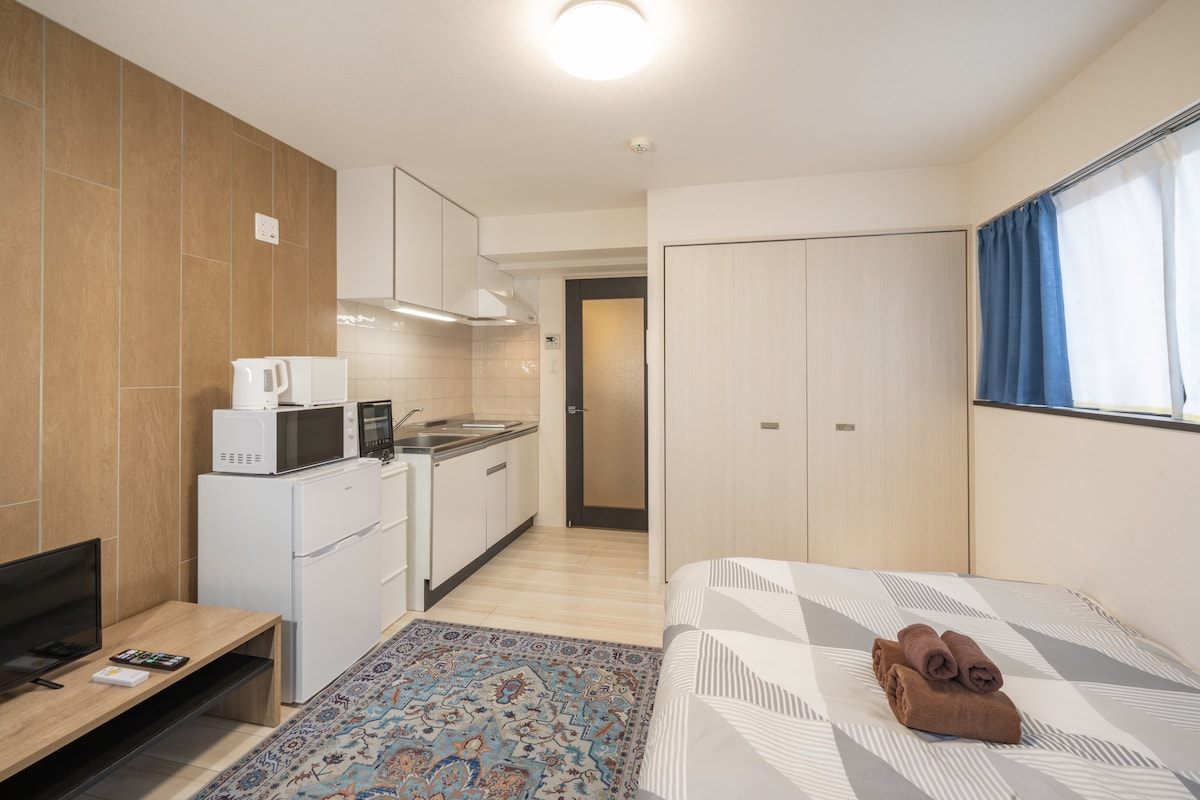 This listing is ideal for families and groups to enjoy medium to long-term stays. This apartment hotel opened in 2023 and is located in a quiet residential area close to the city center. There are waterfronts, parks, and shrines nearby. The spacious 35 ㎡ interior features Japanese-style design. There is 1 queen bed and 3 futons, and it can accommodate up to 5 adults. (Infants under 2 years old sleeping in the same bed as their parents stay free.) There is a compact kitchen where you can cook, a fully automatic washer and dryer, a spacious bathroom, and a separate toilet. There is also an Android TV and free WiFi, so it is a good environment for spending time indoors or working. You can also relax on the rooftop open to guests. Check-in is done using an automated system with a tablet, so you don't have to worry about late night check-in. The door is managed by the latest touch key system. Located a 5-minute walk from the nearest station (Sumiyoshi Station, Hanzomon Line, Toei Shinjuku Line), there is a supermarket nearby. Relax with the whole family at this peaceful place to stay.