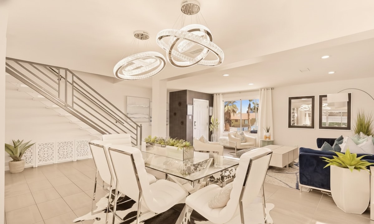 Long term visitors welcome! This incredible 2400+ sq ft home features modern renovations and one-of-a-kind furniture. Walk in and be greeted by an 8ft tall sparkling chandelier and gorgeous marble designed flooring. A pool, jacuzzi, gym, amazing all-Samsung appliances kitchen, 75inch Samsung 4k TV and beautiful light-fixtures throughout... this place has it all. Roughly 15-20 minutes from the strip! NOTE: This is NOT a party space! Please be respectful of the rules and the lovely neighbors.