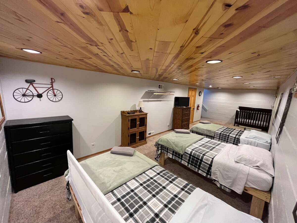 Whether this is for a single, couple, or small group, your stay at this historic home will truly be memorable. You’ll love the MBR suite featuring a gas fireplace, whirlpool tub, and double walk-in custom tile shower. There is an additional very nice full bath/shower on the main floor. The finished lower level has two separate rooms, each with a quality double futon with bedding available for your guests. For this attractive price, the upper 4 bedrooms are locked but may be opened for more