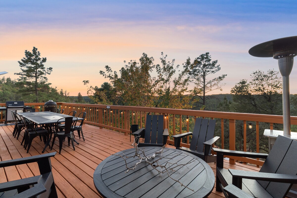 Are you ready for luxury in the tall pines? Experience The Mountain Pad! Perched on the mountainside, this family-friendly cabin is a tranquil escape nestled on four acres of picturesque wilderness. With breathtaking views and a wide range of family-oriented amenities, it's the perfect retreat from the daily grind. This beautiful cabin sleeps up to 10 people with 3 bedrooms, a full kitchen, game room, outdoor dining, kids' obstacle course, clover lawn area, fire pit, and more!