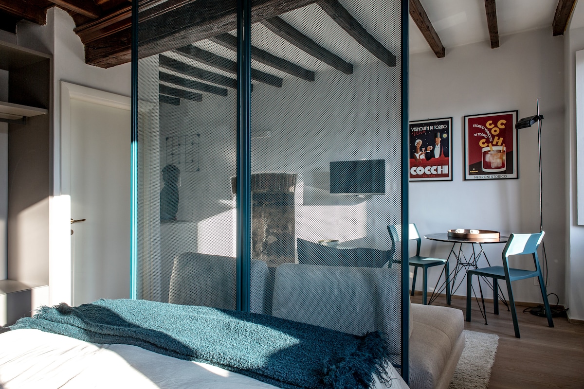 UNICO PER: ❤️ IL DESIGN ❤️LA MIA PULIZIA. ❤️LA CONTINUA RICERCA DEL MIGLIORAMENTO (4 anni di lavoro) Monolocale di DESIGN con balcone in una zona della MOVIDA ( tipica per bar e ristoranti) , all'inizio del tour a piedi del CENTRO STORICO, a 4 minuti a piedi dalla metro e STAZIONE DEI TRENI PORTA NUOVA, a 7 minuti a piedi dal PARCO Valentino.