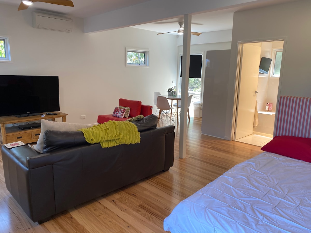 Stylishly renovated self contained studio under the main house of a beach house in Fairhaven. Light filled and spacious this studio contains everything needed for a visit to the Great Ocean Road. Featuring a kitchenette with dining table, sofa bed couches, bath/shower and double bed. Enjoy ocean and bush vistas, walks to the beach, shops and lighthouse. Access to main backyard and BBQ facilities.