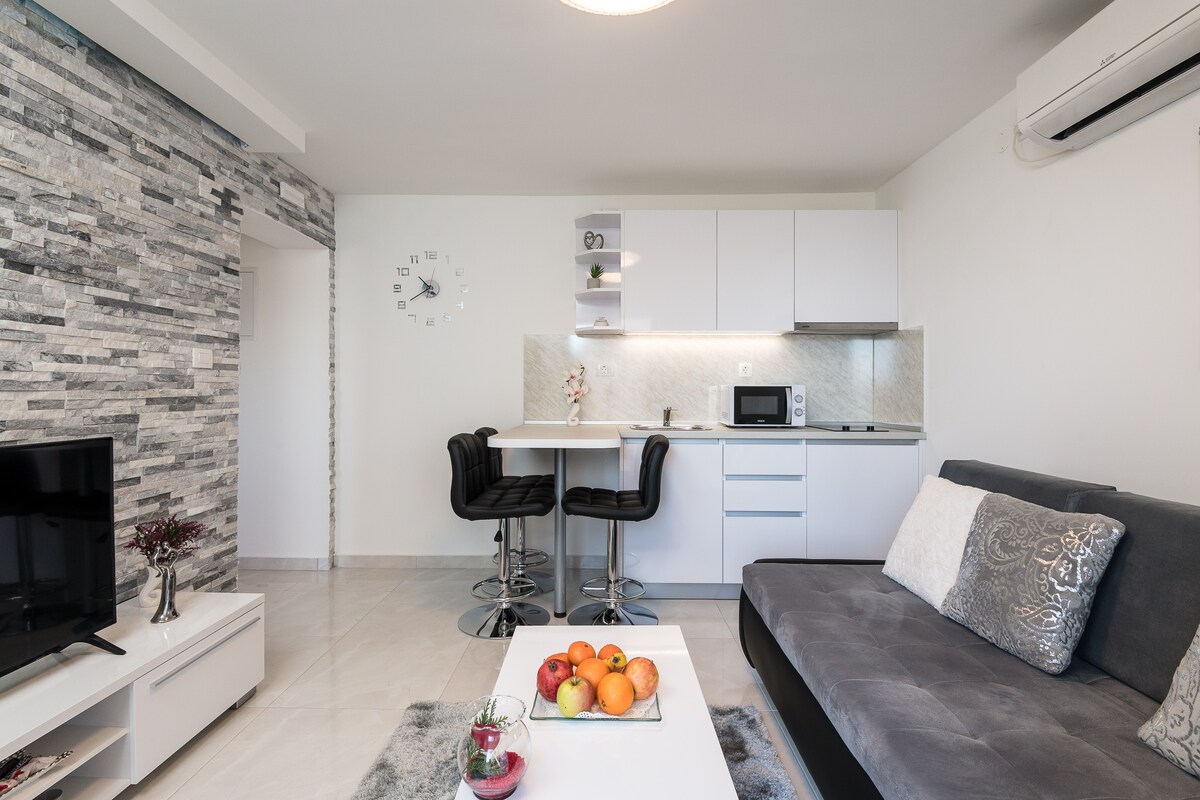 Apartment Klara is situated in a beautiful and peaceful neighborhood, about 20 minutes walk from the Old Town and 300 meters away from two beaches.Bus stop and supermarket are 50 meters away from apartment. Apartment is completely new with separate entrance.There is air-condition, wifi and tv . Kitchen is equipped with everything you need. The apartment is located on the ground floor and has a small terrace where you can enjoy in calm evenings.