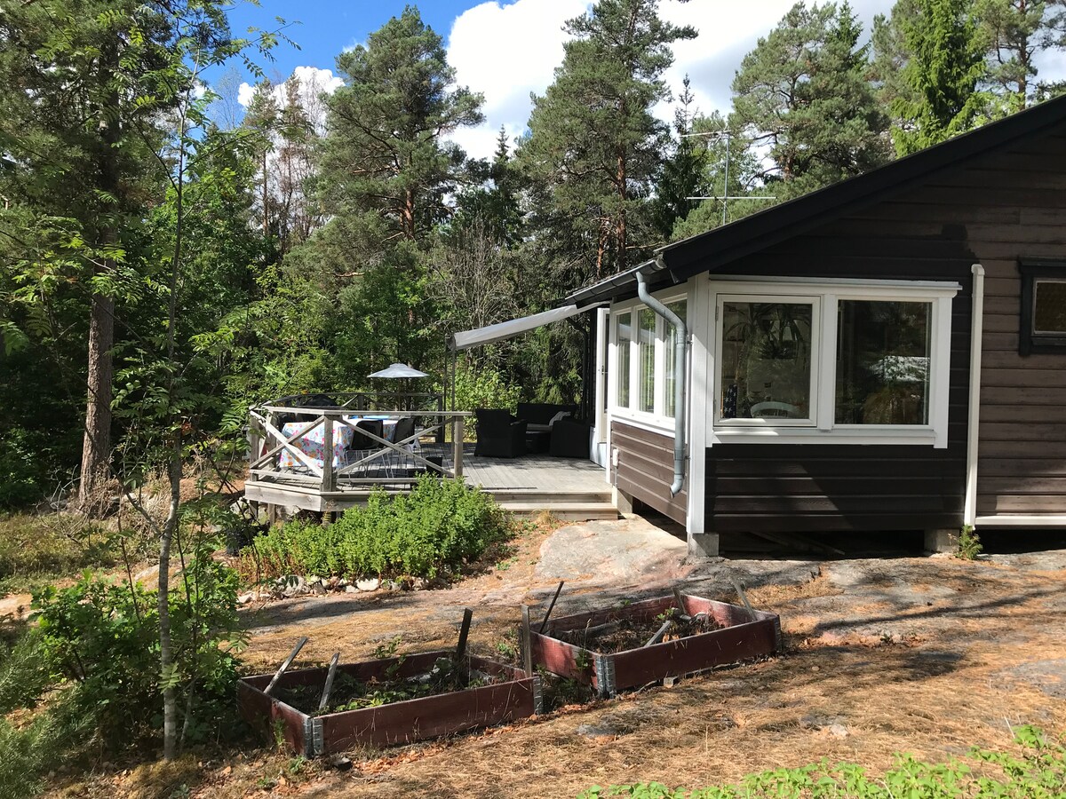 Detached cottage in fantastic Täljö - With private sauna! The house has a kitchen and a bedroom with two single beds. Large wooden deck with morning sun and daytime sun. The forest is just around the corner with nice trails. There are bicycles to borrow for excursions. Charcoal grill available for nice barbecue evenings! 5-minute walk to the train, and 35 minutes by train to Stockholm. (Cost for train about 3.5 Euro) TV with Chromecast. Free WiFi. It is about 10-15 minutes walk to the nearest swimming lake, and by bike it is about 7 minutes.