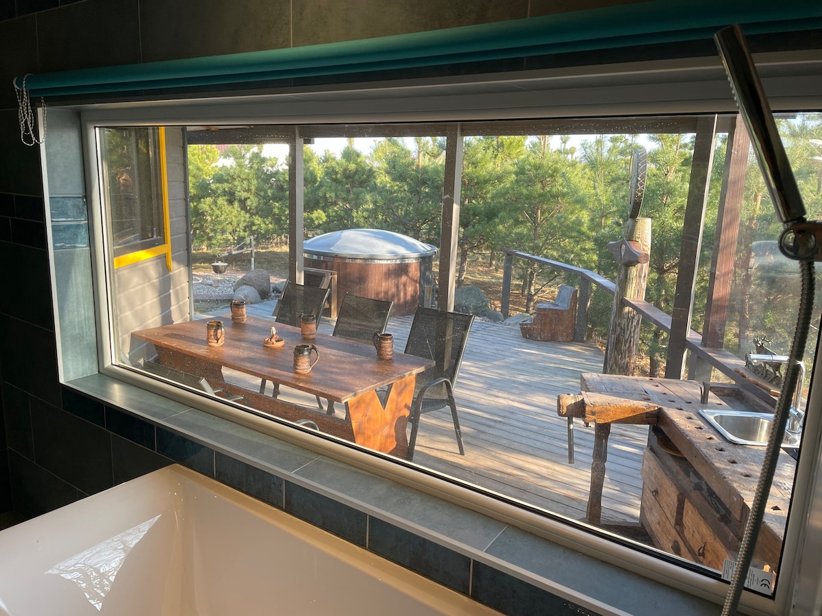 Old style off-grid tiny house in forest + hot tube