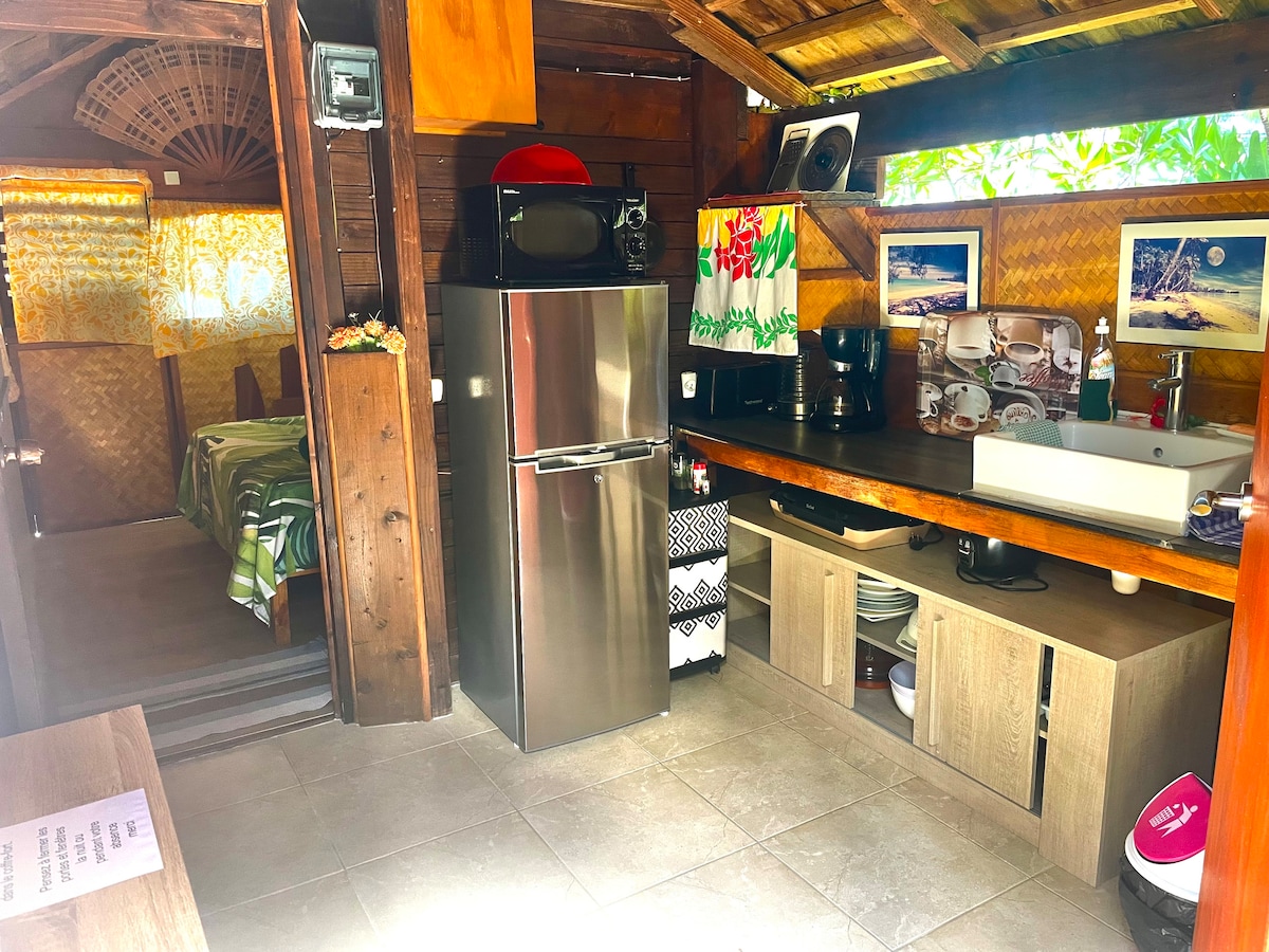 Small beachfront cottage turquoise lagoon... stunning sunsets cozy room, balcony entering a tree overlooking the sea Tiled bathroom, hot water with small kitchen ...coffee maker, kettle, toaster, rice cooker, stove, griddle, dishes, small fridge. Snack and grocery store 150 m away, take-out available 2nd outdoor terrace, garden side Kayaks, bikes, BBQ available free of charge Wifi code upon arrival restaurants and shows nearby "tiki village"