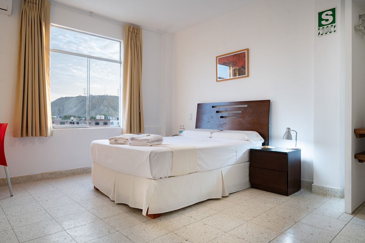 -Hotel Room (12 m2), located 100 meters or one block from the beach in downtown Máncora.- 01 double bed, private bathroom, located on the first floor.- Standing fan, medium-sized closet with a hanger, nightstands, window with mosquito netting to prevent insects from entering your room and overlooking the hotel's garden and pool, -no beach view. -no hot water. -there may be noise from outside.