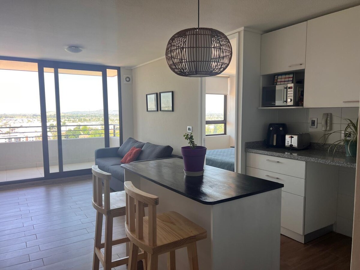 Relájate en este espacio tan tranquilo y elegante, con vista a la cordillera, completamente equipado, cortinas black out en cuarto y sala, calefactor y aire acondicionado, estacionamiento propio dentro del edificio, conserje 24 horas, Univ. Católica a 8 minutos a pie e Inacap a 8 minutos en auto, a pasos del Mall Plaza y de supermercados Jumbo y Lider, farmacia, minimark y notaria a media cuadra, restaurantes y pizzerias cerca, para un mejor servicio al llegar debes registrarte en conserjería