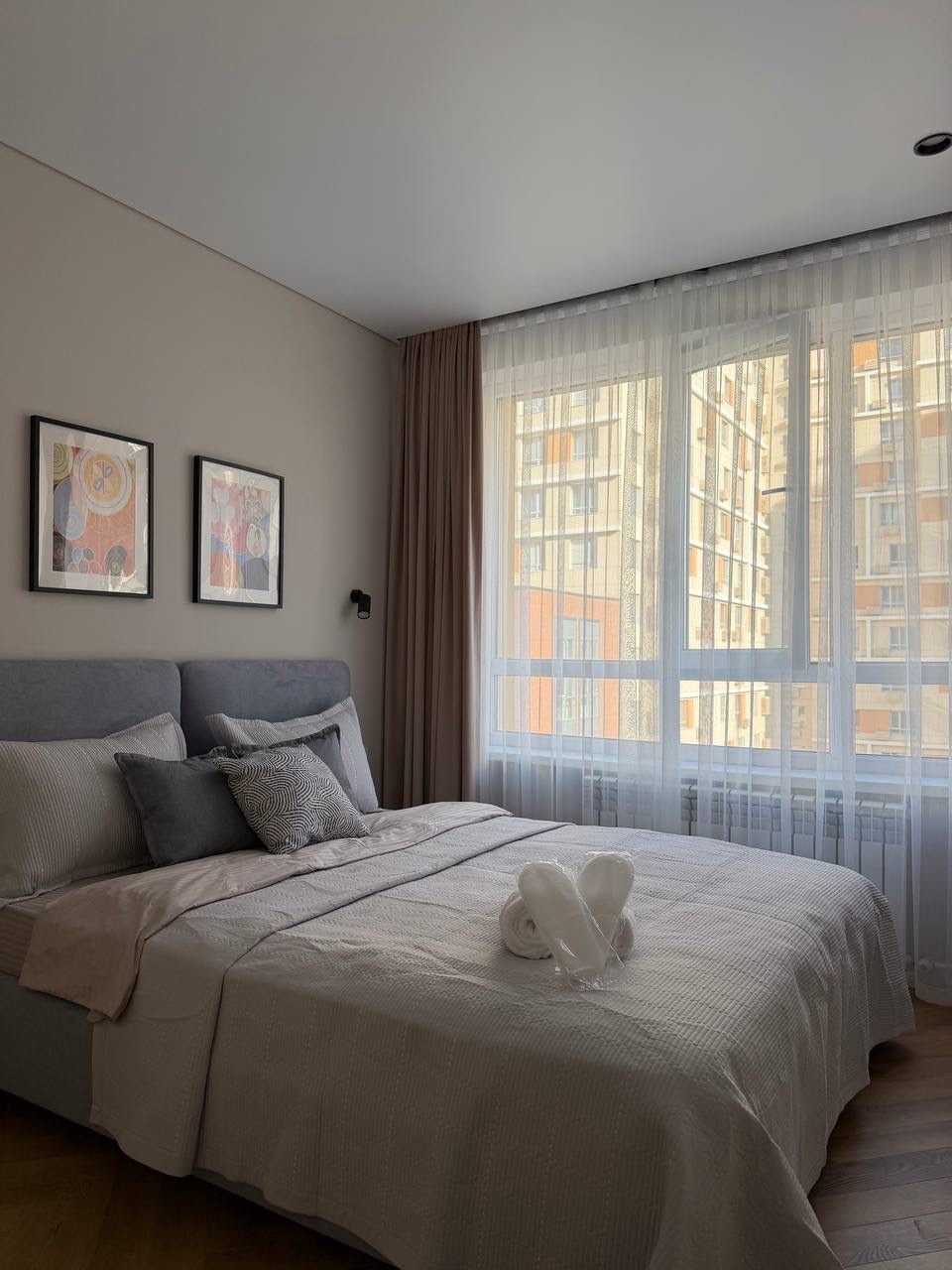 Один из лучших вариантов проживания в этом комплексе! Идеальная чистота и комфорт! Квартира оснащена шкафом для одежды, стиральной машиной, сушилкой для одежды, собственной ванной комнатой с душем в квартире также высокоскоростной, телевизор-смарт с диагональю 49 дюйма, удобные ортопедические матрацы, шторы black-out. Вы можете готовить как дома, кухня оснащена приборами первой необходимости. Квартира расположена на 9 этаже нового жилого комплекса