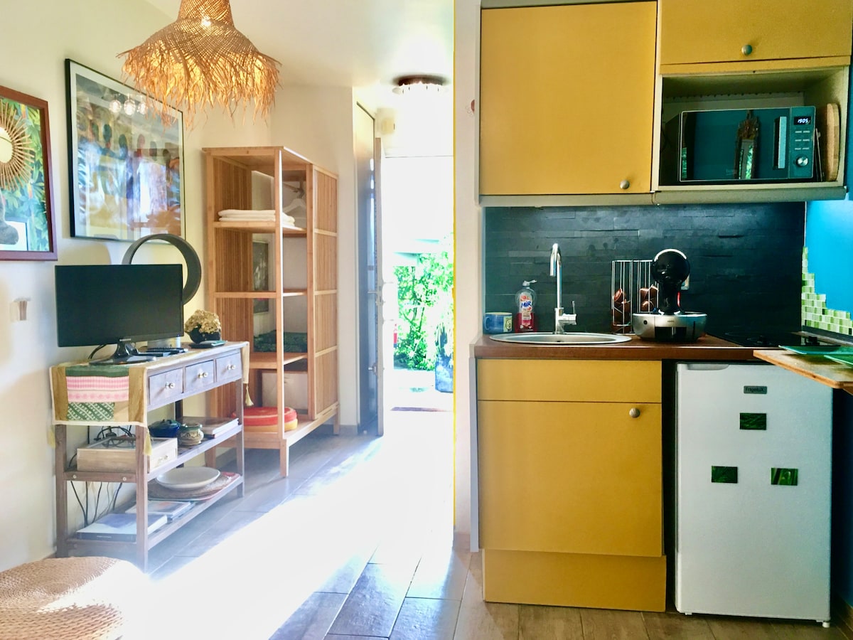 Apartment (30 m²) ideal for 2 people, located by the sea on the ground floor It consists of a main room with kitchen, dining area and living room (TV with French channels), a bathroom, a separate bedroom with a double bed (160 cm) and a terrace with sea view. It has air conditioning and Wi-Fi Sliding interior doors Access to the sea and beach via wooden stairs Common areas (petanque court, ping pong table and children's playground)