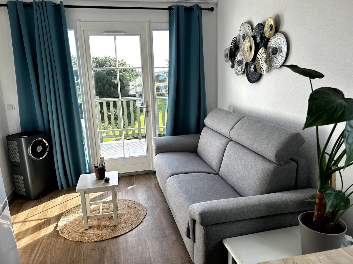 Apartment 3/4 people, terrace overlooking the golf course, pine trees and sea. Activities available on-site: From April 27 to September 15: Water area accessible with bracelets available in the apartment. Free water aerobics classes from Monday to Friday in July and August. Free tennis rackets and golf clubs available at the entertainment house reception. Entertainment in July and August in the complex. Port de Bourgenay is a 5-minute walk away. Veillon Beach 15 minutes away