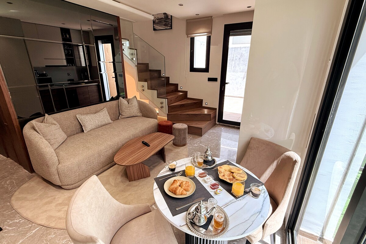 Modern 2BR duplex in Dar Bouazza Tamaris with beautiful pool views and full privacy. Sleeps 5 + infant. Includes 2 bathrooms, high-speed Wi-Fi (100Mbps), and a workspace. Enjoy 6 infinity pools, gym, game room, and direct beach access. Fully equipped kitchen with coffee machine, dishwasher, and washer. Perfect for families, friends, or remote work. Peaceful residence, modern decor, sunny and spacious — ideal for relaxing stays or fun getaways. Close to restaurants, cafés, and beach activities.
