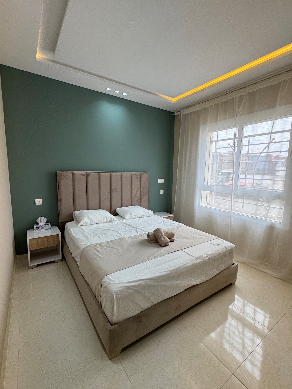 This charming luxury apartment is located in the heart of Tangier’s Mesnana Golf area Enjoy fast Wi-Fi, free parking, and handcrafted Moroccan decor that adds a warm, and giving the space a soulful Moroccan touch,Just 5 minutes from the beach, forest, and surrounded by cafés, luxury restaurants, and supermarkets. Located on a main road with easy transport access This apartment is ideal for couples, families, or anyone looking to explore Tangier while enjoying a peaceful and stylish home base.
