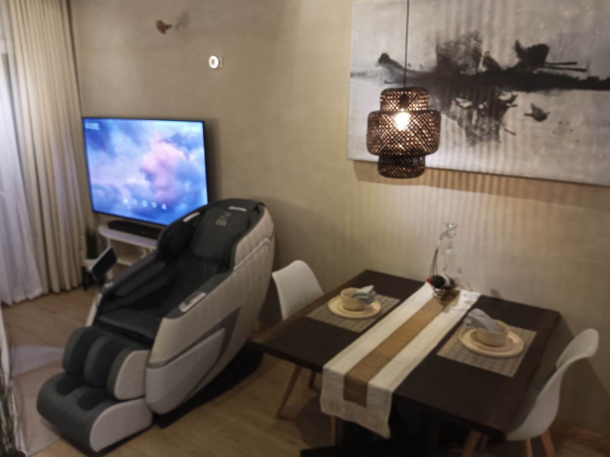 Welcome to Calma Resthouse! A pet-friendly space designed for work and rest.🍃 Enjoy 2 cozy bedrooms, a 4–5ft dip pool, Zion’s massage chair, videoke w/JBL speaker, full kitchen, & outdoor grill. Warm pin lights and track lights are used throughout the space, with no strong center light, creating a soft, cozy, & calm ambient vibe. Essentials provided, just bring yourself! Quiet bedrooms downstairs, fun and bonding upstairs. Safe with private parking & e-fence. Perfect for anyone seeking calm.