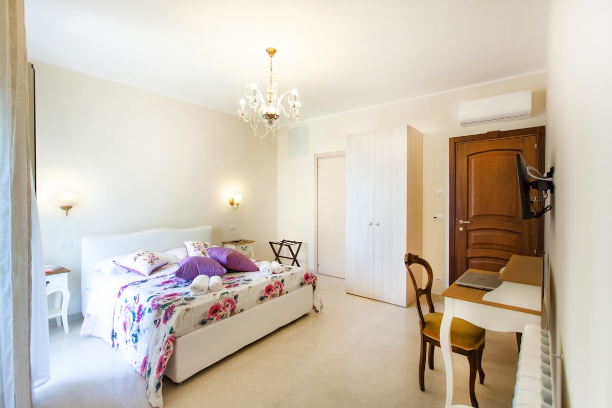 The Althea Suite is perfect for those who want to try a Sicilian experience, not only in the outdoor environment but also in this large and independent room. In fact, from the bathroom to the small kitchenette with sink, microwave and dishes, and to the dining table, everything recalls the Sicilian character in the materials used to finish and furnish it. Featuring a patio with a separate entrance, the studio has three large windows overlooking the garden and surrounding landscape. The pool is available in summer