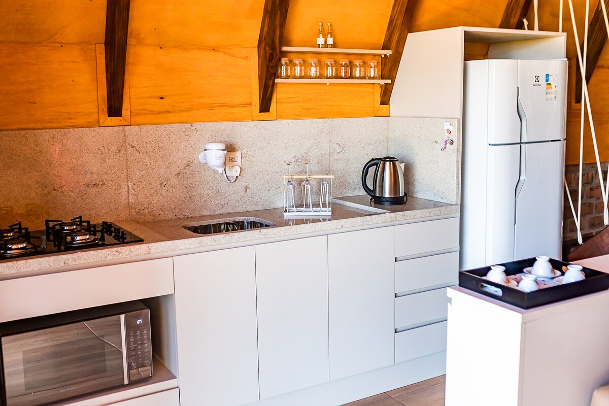 The cabin is cozy and surrounded by nature with a lot of peace in a rural area, close to everything. If you are looking for tranquility, fresh air and moments of connection, this is the ideal place for you. Experience the sunset with a beautiful view while enjoying a whirlpool in the Spa and drinking that wine that harmonizes with your peace. After a candlelit dinner, you can enjoy the evening by the fireplace with the charm that the fire provides. Book now and live this unique experience.