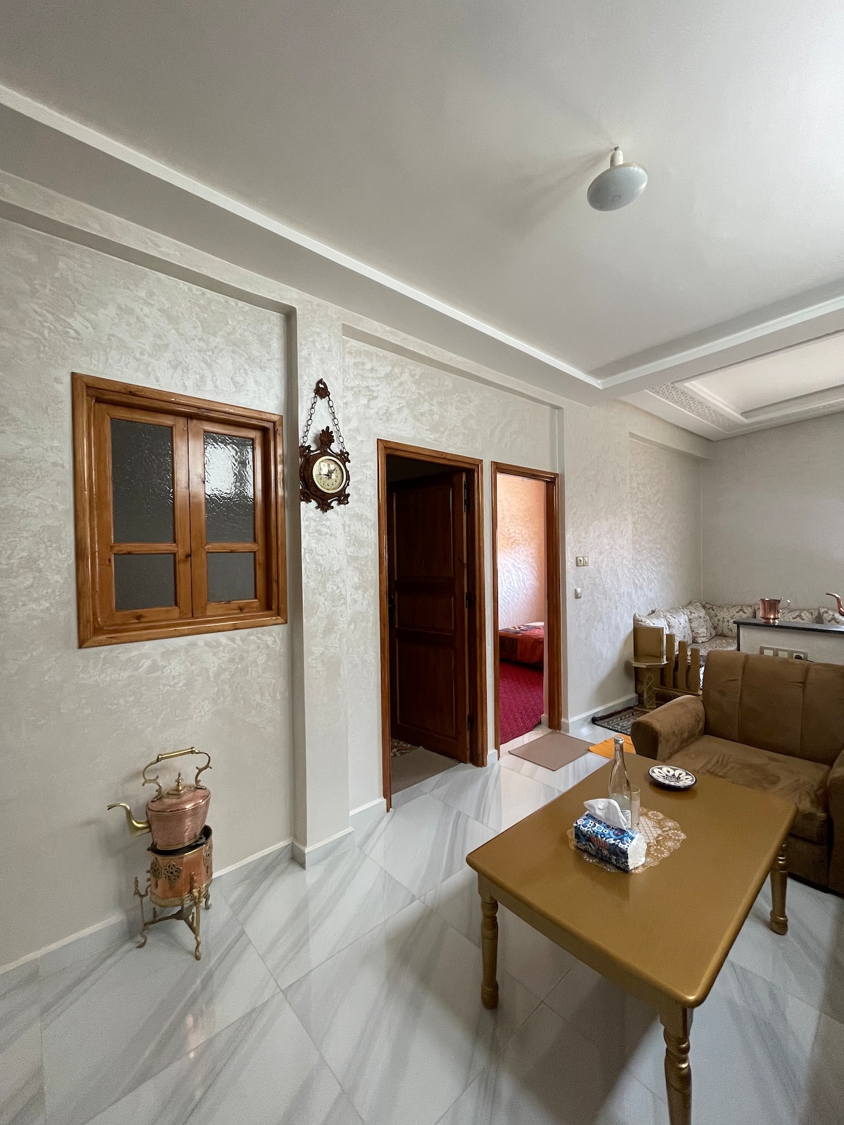 Bright and spacious apartment on the 1st floor of the Riad Residence in Taroudant, ideal for a comfortable family stay. Enjoy a fully equipped kitchen, elegant Moroccan lounges, quiet rooms and a pleasant balcony. Secure neighborhood, close to shops and minutes away from the ramparts. Fast Wi-Fi, air conditioning, impeccable cleanliness. Your perfect base for discovering Taroudant in peace.