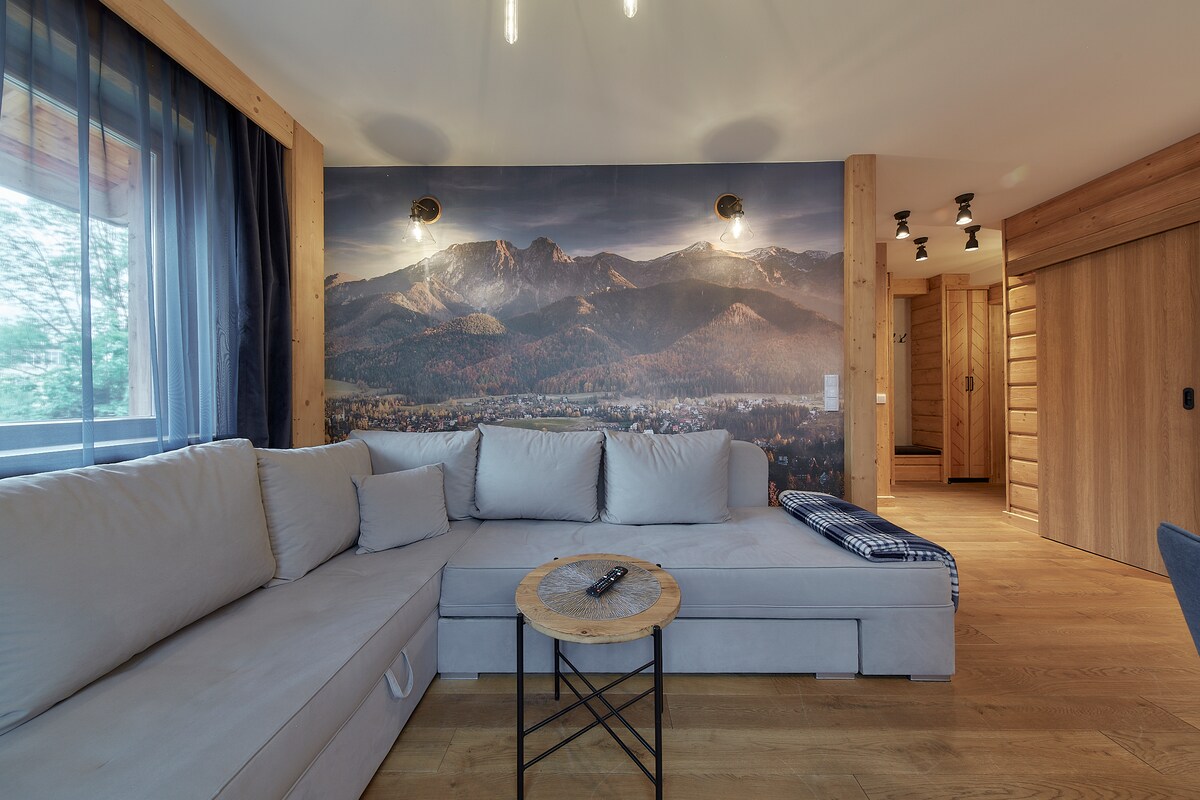 Dwuosobowy lub czteroosobowy apartament z jedną sypialnią, w samym centrum miasta Zakopane. Apartament składa się z pokoju dziennego z aneksem kuchennym, sypialnią, łazienką oraz tarasu. W przestronnym pokoju znajduje się w pełni wyposażony aneks kuchenny. Stół i krzesła, sztućce, naczynia, szklanki, kubki, kieliszki, garnki, lodówka, przybory kuchenne, czajnik elektryczny, zmywarka, płyta indukcyjna. Pozwoli to na przygotowanie własnych posiłków.
