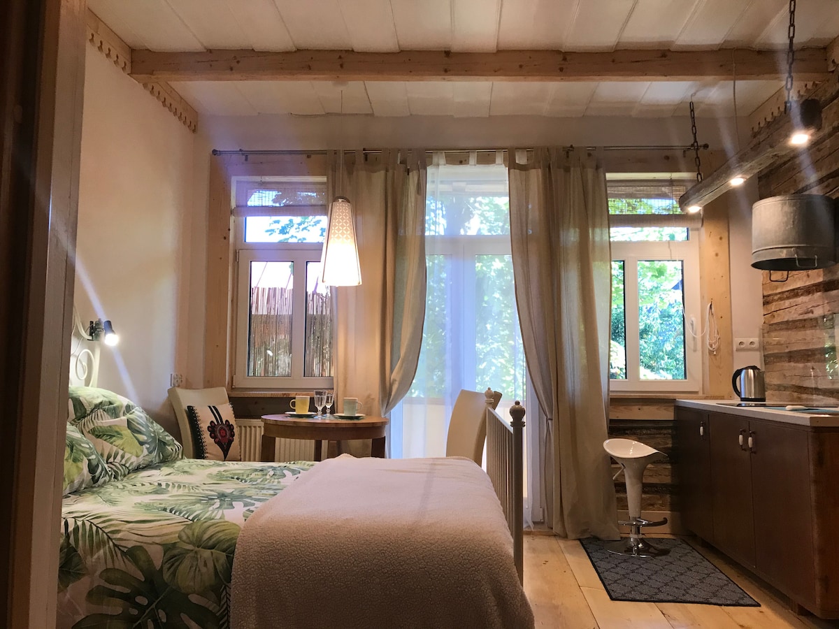 Stylowy apartament znajduje się w ponad 100-letniej drewnianej Willi Jasna, po remoncie, w centrum Zakopanego, blisko dworca i Krupówek. Budynek usytuowany jest przy bocznej ulicy, na około dużo zieleni, miejsce parkingowe. Apartament posiada 2os. łóżko 140x200, aneks kuchenny, a w nim kuchenka indukcyjna, zlew, mała lodówka, naczynia, sztućce, czajnik elektryczny. Obok łóżka kącik jadalny, wygodna łazienka z prysznicem z deszczownicą. Jest także balkon wychodzący na ogródek za domem.