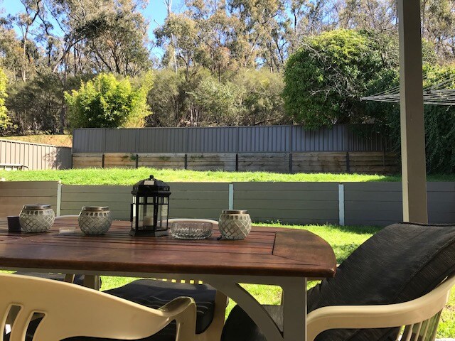 The Little House on the Hill at the eastern end of Warburton overlooks the chooks, the veggie patch, the orchard and across the valley to gorgeous 270° views. It is next door to the Big House, set on an acre that slopes down to the Yarra River. A great swimming spot on hot days and a good way to access the town and the rail trail (five minutes there, maybe ten minutes return - uphill). There are plenty of lovely walks nearby including the Aqueduct Trail that starts further up the hill.