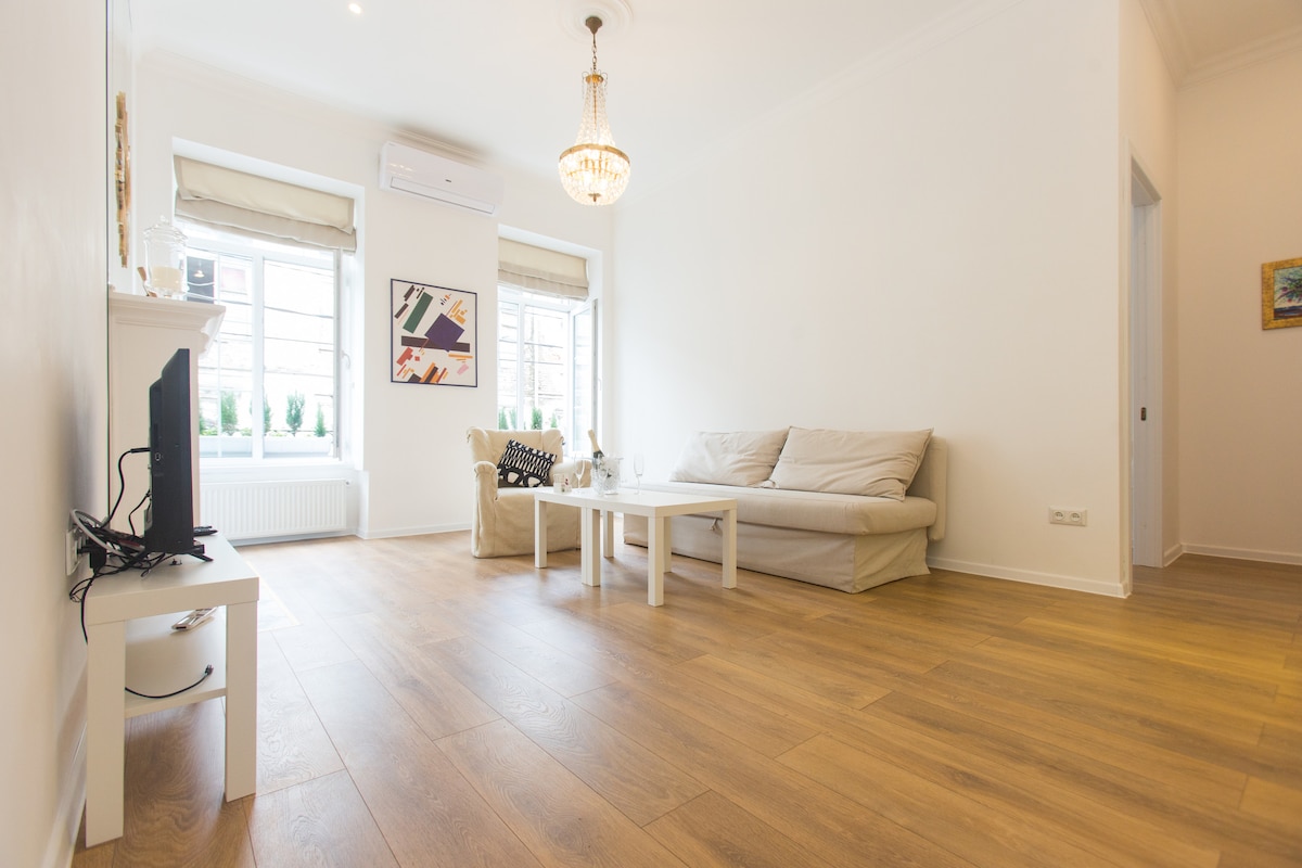 The one-bedroom apartment is a three-minute walk from Freedom Square and a stroll away from everywhere you would want to go: all the sightseeing sites, hidden gems, the trendiest restaurants, and bars, botanical garden, parks, and museums. Although at the heart of the Old Town bustle, the apartment has an entrance from a secluded street, maintaining a relative calm.