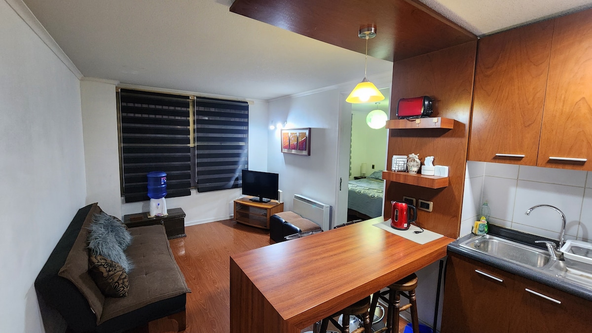 Nice Home Studio, cozy and comfortable, with everything you need for a pleasant stay, located in a quiet area of Santiago. It has a large terrace where you can do daily activities, weather permitting. Fully-equipped kitchen with electrical appliances and a hot water heater. Excellent connectivity, close to two Metro stations and surrounded by a wide and diverse range of shops. It has Wi-Fi internet and cable TV.