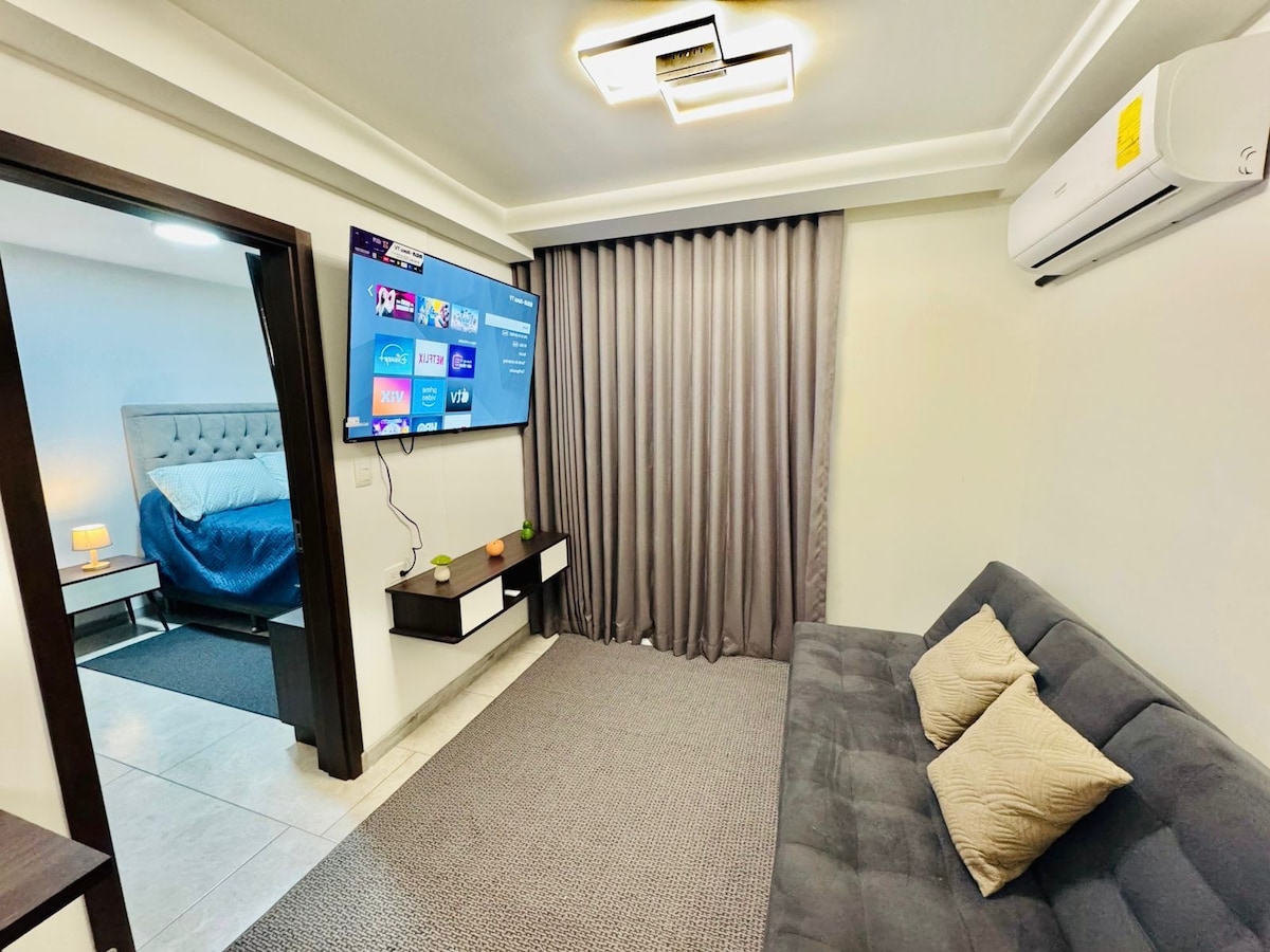 ¡Bienvenido a tu nuevo hogar! Encantador apartamento de una habitacion amplia con walking closet, sala, comedor y baño. La sala es perfecta para relajarse en un sofá cómodo y TV. Cocina completamente equipada. Disfruta la comodidad de lavadora/secadora. Ubicación privilegiada y muy segura. Atrás de la EMBAJADA AMERICANA. Disfrute gratis en la terraza del piso 24 piscina, jacuzzi, área de juegos infantiles Centro comercial en el edificio con restaurantes y muchas tiendas para tus compras.
