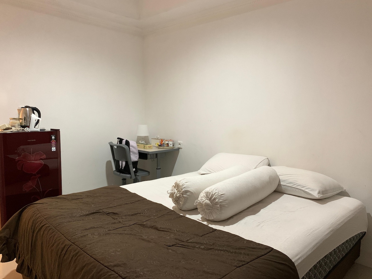 Your home away from home. A cozy studio apartment, uniquely designed in modern style for 2 guests + 1 little child. The room equipped with 1 queen size bed, modern bathroom, kitchen with basic cooking equipment, and balcony. Free parking, pool, gym, lobby area with cafe, restaurant, laundry, and mini market. Facilities: - 55 " smart TV - Wifi - AC - hot shower - refrigerator - microwave - electric stove - kettle - kitchen sink - basic cooking equipment - iron - hair dryer Note: - No breakfast