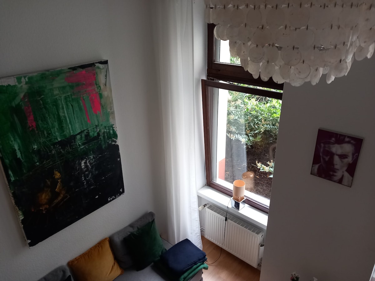 DasGeburtshaus der "Marlene Dietrich. Im 3. Stock im Hinterhaus befindet sich das Apartment. Es wurde renoviert in einem Stil, der Elemente eines Industrielooks und der, der 50 Jahre. Das Apartment hat 43 qm und ist ein offener Raum. Das Bad ist mit einer Glaswand vom Wohnraum getrennt. Die Küche ist offen in den Wohnraum integriert. Der Schlafplatz ist auf einem Podest. Es gibt auch ein WLan.. Vor der Türe halten 2 Buslinien,. Anbindung an die S-Bahn ist nur ca. 5 Minuten zu Fuß entfernt.