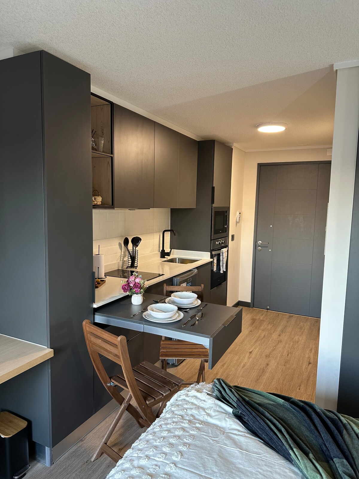 Enjoy a spacious, bright and functional space that integrates bedroom, kitchen and dining room in a single environment. Equipped with a Rosen Tempo bed and a private bathroom. Located in a safe and central neighborhood of Temuco, steps from the Portal Mall, clinics and universities. Convenient access through concierge. Ideal for those looking for comfort, good location and rest during their trip.
