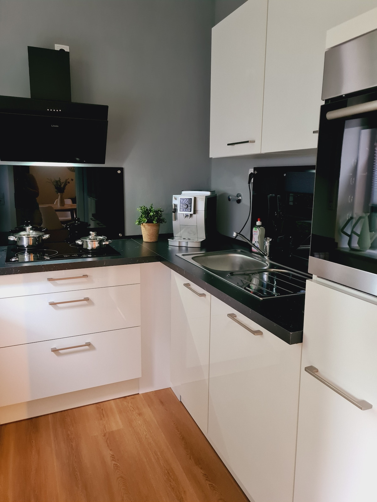 Beautifully renovated and individually furnished, quiet guest suite with private entrance on 2 floors with 40 square meters. Best location, 10 minutes' walk from the city park and the old town, numerous excursion possibilities nearby. The private terrace with access from the stylish living room, the view of the beautiful garden, the separate kitchen, the guest toilet as well as upstairs the bathroom and especially the sleeping area with a view of the surrounding gardens invite you to a relaxing stay.