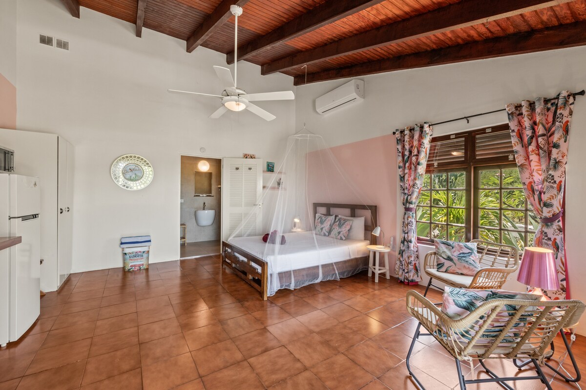 Welcome to Terra, a one-bedroom retreat at Villa ZEN Haven, where earthy elegance meets island serenity. Terra is the perfect blend of nature, comfort, and luxury - minutes from Curaçao’s most stunning beaches. Designed with warm wood tones, rich neutrals, and natural textures, Terra offers a grounding and peaceful ambiance. The bedroom features a plush queen-size bed, uniquely designed by an artist, while the modern en-suite bathroom with warm water adds a spa-like experience to your stay.