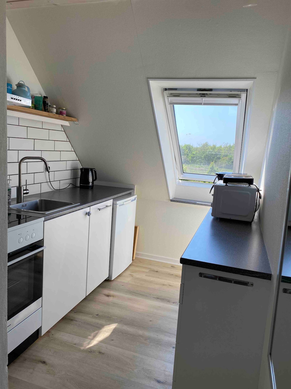 Unique opportunity to stay directly on the pier and just 3 meters from the waterfront in the iconic Bjarke Ingels building on the newly built Aarhus Island. Wi-Fi and private parking space included. In good weather, the harbor promenade just outside is well visited. Cozy and well-utilized bathhouse with sleeping loft. Fantastic, south-facing, 180-degree panoramic views of the water, harbor and city skyline. Small living at its best - perfect for couples or business travelers. The kitchen with electric kettle and fridge - not possible to cook hot food.